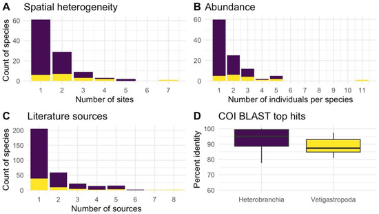 Figure 2. Distribution of species of Heterobranchia (purple) and Vetigastropoda (yellow) by (A) the number of sites where they were collected, (B) the number of specimens, and (C) the number of literature sources where the species is recorded. (D) Percent identity of the best BLAST hit for all barcoded specimens.