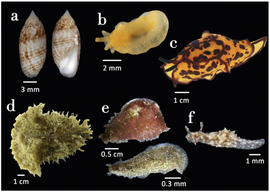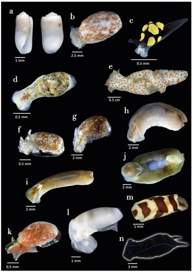 76. Oskars, T.R.; Bouchet, P.; Malaquias, M.A.E. A new phylogeny of the Cephalaspidea (Gastropoda: Heterobranchia) based on expanded taxon sampling and gene markers. Mol. Phylogenetics Evol. 2015, 89, 130–150. [Google Scholar] [CrossRef]