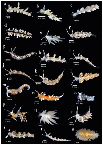 Figure 5. Nudibranchia, Cladobranchia: (a) Limenandra evanescenti n. sp. (MCZ:Mala:393766); (b) Doto sp. (MCZ:Mala:393816); (c) Embletonia gracilis (MCZ:Mala:393844); (d) Eubranchus putnami n. sp. (MCZ:Mala:393748); (e) Eubranchus sp. (MCZ:Mala:393798); (f) Herviella albida (MCZ:Mala:393849); (g) Caloria indica (MCZ:Mala:393881); (h) Cratena sp. A (MCZ:Mala:393850); (i) Cratena sp. 5 (MCZ:Mala:393846); (j) Cratena sp. B (MCZ:Mala:393872); (k) Favorinus mirabilis (MCZ:Mala:393795); (l) Favorinus japonicus (MCZ:Mala:393840); (m) Moridilla maldivensis n. sp. (MCZ:Mala:393739); (n) Sakuraeolis marhe n. sp. (MCZ:Mala:393879); (o) Noumeaella sp. (MCZ:Mala:393817); (p) Pteraeolidia aff. semperi (MCZ:Mala:393738); (q) Tergiposacca perspicua n. sp. (MCZ:Mala:393841), ventral view; (r) Godiva sp. (MCZ:Mala:393845); (s) Samla riwo (MCZ:Mala:393744); (t) Samla bicolor (MCZ:Mala:393873); (u) Phestilla lugubris (MCZ:Mala:393735). Photos by T. J. Cunha.