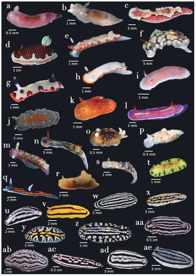 Figure 6. Nudibranchia, Doridina: (a) Hallaxa indecora (MCZ:Mala:393835); (b) Hallaxa fuscescens (MCZ:Mala:393778); (c) Glossodoris acosti (MCZ:Mala:393870); (d) Goniobranchus glenei; (e) Goniobranchus setoensis (MCZ:Mala:393833); (f) Goniobranchus conchyliatus (MCZ:Mala:393705); (g) Goniobranchus fidelis (MCZ:Mala:393721); (h) Goniobranchus albonares (MCZ:Mala:393832); (i) Verconia simplex (MCZ:Mala:393831); (j) Dendrodoris nigra (MCZ:Mala:393710); (k) Rostanga sp. 2 (MCZ:Mala:393742); (l) Mexichromis similaris (MCZ:Mala:393877); (m) Hypselodoris maculosa (MCZ:Mala:393783); (n) Hypselodoris nigrostriata; (o) Thordisa cf. oliva (MCZ:Mala:393780); (p) Goniodoridella sp. (MCZ:Mala:393815); (q) Roboastra gracilis (MCZ:Mala:393829); (r) Gymnodoris ceylonica; (s) Gymnodoris sp. (MCZ:Mala:393743); (t) Phyllidia sp. (MCZ:Mala:393878); (u) Phyllidiella sp. (MCZ:Mala:393785); (v) Phyllidia koehleri (MCZ:Mala:393746); (w) Phyllidia rosans (MCZ:Mala:393796); (x) Phyllidia alyta (MCZ:Mala:393788); (y) Phyllidia picta (MCZ:Mala:393774); (z) Phyllidia varicosa (MCZ:Mala:393757); (aa) Phyllidiella sp. 1 (MCZ:Mala:393736); (ab) Phyllidiella zeylanica; (ac) Phyllidiella striata (MCZ:Mala:393808); (ad) Phyllidiopsis sp. (MCZ:Mala:393747); (ae) Phyllidiopsis xishaensis (MCZ:Mala:393740). Photos by T. J. Cunha; images of (d,r,ab) courtesy of Davide Seveso; images of (j,m,n) courtesy of Davide Maggioni.
