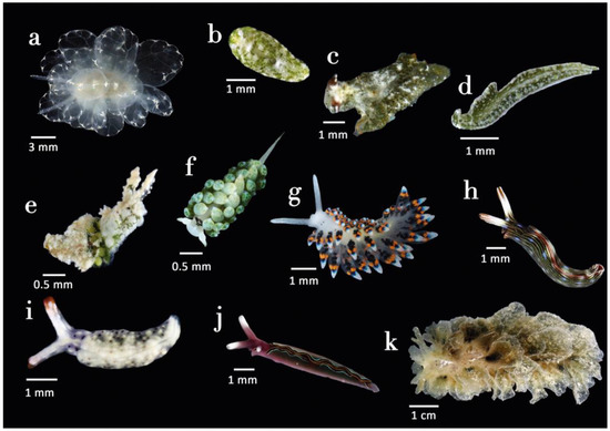 Figure 7. Sacoglossa: (a) Cyerce elegans (MCZ:Mala:393754); (b) Elysia pusilla (MCZ:Mala:393737); (c) Elysia cf. marginata (MCZ:Mala:393708); (d) Elysia sp. 11 (MCZ:Mala:393722); (e) Elysia sp. 44 (MCZ:Mala:393711); (f) Costasiella fridae n. sp. (MCZ:Mala:393874); (g) Stiliger sp. 1 (MCZ:Mala:393830); (h) Thuridilla sp. 6 (T. gracilis species-complex) (MCZ:Mala:393741); (i) Thuridilla vataae (MCZ:Mala:393868); (j) Thuridilla livida (MCZ:Mala:393767); (k) Polybranchia jensenae (MCZ:Mala:393800). Photos by T. J. Cunha.