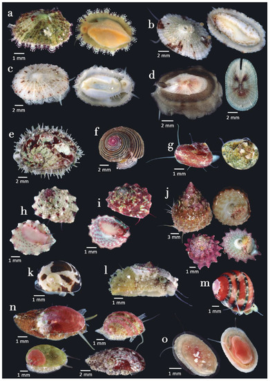 88. Uribe, J.E.; Williams, S.T.; Templado, J.; Buge, B.; Zardoya, R. Phylogenetic relationships of Mediterranean and North-East Atlantic Cantharidinae and notes on Stomatellinae (Vetigastropoda: Trochidae). Mol. Phylogenet. Evol. 2017, 107, 64–79. [Google Scholar] [CrossRef] [PubMed]