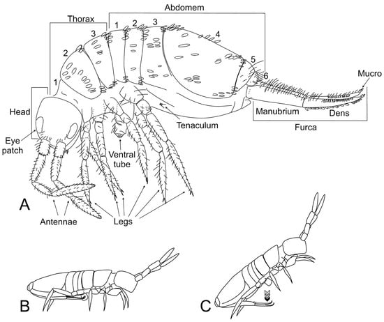 Springtails tagmosis is remarkably similar to the one seen in Insecta. Their body is divided into a head, thorax and abdomen. The head always bears a pair of anterior four-segmented antennae, but in some taxa there can be subsegmentation or partial fusions of the antennal segments. The thorax has three segments similarly to other hexapods, pro, meso and metathorax, and each one has a pair of legs. The number of abdominal segments is fixed in Collembola, and it is always six, although in different lineages the fusion of segments may obscure this observation (Figure 1A) [1]. Springtails morphologically diverge from the other hexapod classes especially by their exclusive abdominal appendages [4] (Figure 1A). The most evident is the jumping organ, the furca (or furcula), which gave them their common name. This appendage is located in the ventral face of the fourth abdominal segment and it is primarily used to escape from predators. The furca works in synergy with another abdominal appendage, the tenaculum (or retinaculum). This small structure is found in the ventral side of the third abdominal segment and has some apical teeth which hold the furca rested near the body. Whenever in danger, these appendages are detached from each other, the furca is quickly pressed against the ground and the springtail jumps (Figure 1B,C). However, in many euedaphic taxa, both furca and tenaculum may be strongly reduced or entirely missing [7]. So, a better synapomorphy of springtails to circumscribe the group is the ventral tube (or collophore), which is also located in the ventral face of the abdomen (in the first segment). This very peculiar appendage holds two apical vesicles which are primarily used in the fluid balance but can also help in the oxygen absorption, grooming, jumping and attaching the specimens to smooth surfaces [1,7]. The ventral tube is present in all sprigtails and was used by Sir John Lubbock in 1870 to name the class as “Collembola” (from Latin “colla” = glue; from Greek “embolon” = a plug) [1].