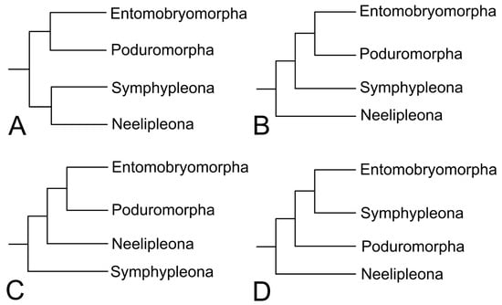 Some different phylogenetic hypotheses for the relationships of the Collembola orders found by recent studies (only topologies in which the orders were considered monophyletic are represented). Trees after the mentioned authors: (A) Bellini et al. [9]; (B) Gao et al. [20], Bellini et al. [9]; (C) Schneider et al. [21], Schneider and D’Haese [22]; (D) Leo et al. [23].