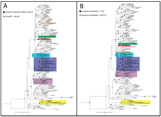 Phylogenetic relationships of the species in the genus Niphargus inferred from maximum likelihood (A) and Bayesian (B) approaches, including ultrafast bootstrap (UFBoot), Shimodaria–Hasewaga approximate likelihood ratio test (SH–aLRT) and Bayesian posterior probability support values. Outgroup species have been removed. The specimens from Hungary are in bold and the clades including specimens from Hungary are colour coded using the same colours as on Figure 1 and Figure 3.
