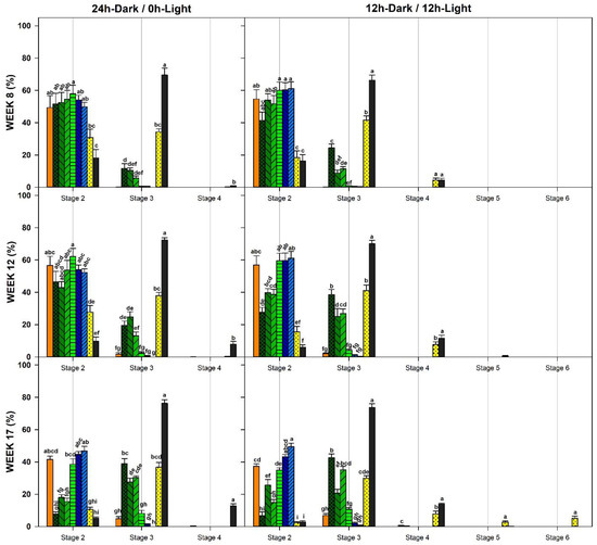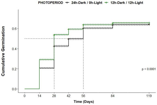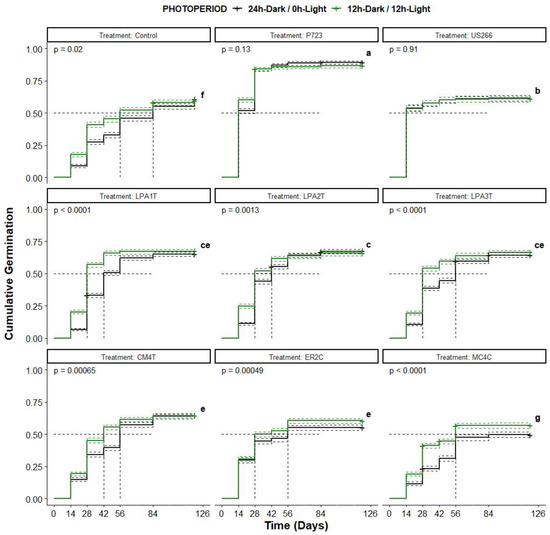 Figure 2c). These areas were considered sub-replicates. The number of seeds in each developmental stage was recorded at each data collection time. All experiments were repeated once. Percent data were arcsine-transformed prior to the analysis using a multi-factor ANOVA by each data collection point. Mean separation was assessed using Tukey’s methods at the α = 0.05 significant level. Statistical analyses were completed with JMP Pro15 (Manufacture, SAS Institute Inc., Cary, NC, USA). Survival analysis was performed using the survival package in R studio 3.2.5. Time-to-event data, in this case, the time from sowing to germination (Stage 2), were analyzed. A Kaplan–Meier estimator was used to estimate the survival function with 95% confidence intervals. Log-rank tests were performed to evaluate differences between survival curves at the α = 0.05 significant level. Multiple pair-wise comparisons were performed using a log-rank test with Bonferroni correction to adjust