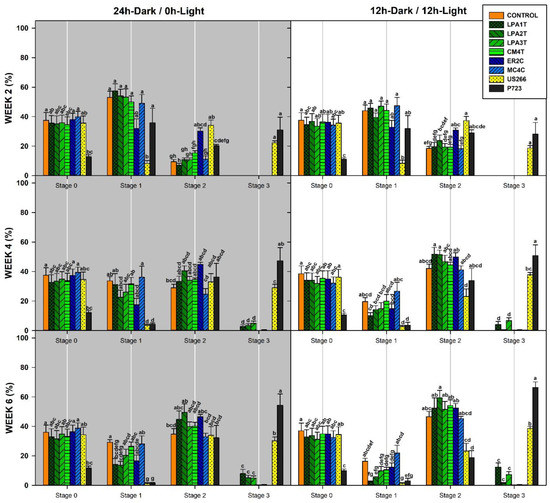 Petri dishes were sealed with one layer of sealing film and incubated under both 0/24 h and 12/12 h light/dark photoperiods at 20 °C in a Percival I-35LL growth chamber (Percival Scientific, Boone, IA); light was provided by cool-white florescent tubes (General Electric F20T12/CW) at 35 μMm