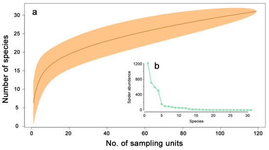 Species richness estimation (a) by Mao Tau estimator with 95% confidence intervals and (b) the rank abundance plot for the whole spider assemblage captured in pitfall traps.