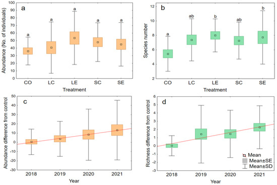 To follow up on how abundance and species richness changed over the study years relative to the control, we calculated a control-treatment abundance and richness difference for each plot and year. The LMM models showed that there was no significant treatment effect, i.e., the control-treatment difference was not dependent on the type of gap treatment, neither in terms of abundance nor species richness. However, in the case of both measures, the control-treatment differences gradually increased over time during the observation period (effect of year, abundance difference: F = 4.99; d.f. = 1, 86; P = 0.0281; Figure 3c; effect of year, species richness difference: F = 13.58; d.f. = 1, 86; P = 0.0004; Figure 3d). The random effect of the block was small (5.53% of total variance) in the case of abundance difference, whereas it was larger (28.8% of total variance) in the case of richness difference.