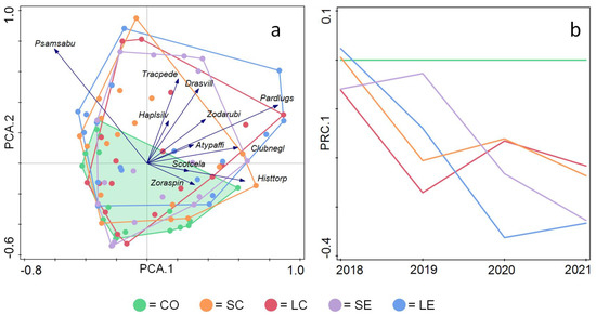 Ordination plots of spider community change in gap treatments and over time. (a) PCA biplot. Dots indicate the position of spider assemblages in yearly samples of experimental plots in the different treatments, only considering post-implementation years; species arrows indicate species responses in the ordination space. (b) Principal Response Curves analysis plot indicates along one ordination axis how much assemblages in the different treatments differ from control assemblages over the investigated period. Abbreviation of treatments as in legend to Figure 1; species abbreviations as follows: Psamsabu = Psammitis sabulosus, Tracpede = Trachyzelotes pedestris, Haplsilv = Haplodrassus silvestris, Drasvill = Drassyllus villicus; Atypaffi = Atypus affinis; Scotcela = Scotina celans, Zoraspin = Zora spinimana, Pardlugs = Pardosa lugubris, Clubnegl = Clubiona neglecta, Histtorp = Histopona torpida.