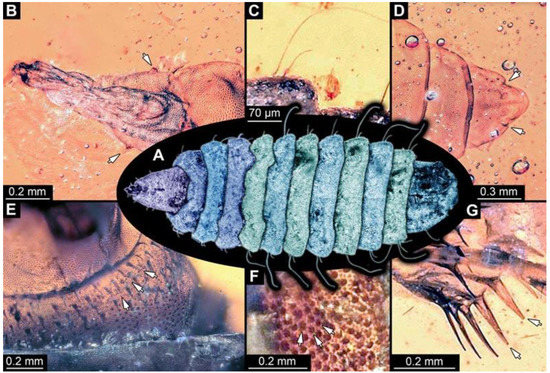 (27) PED 0653: Specimen strongly crumpled (Figure 9B), air inclusions and particles in the amber conceal most details, no measurements of the body were recorded. Head capsule well preserved. Short spine-like setae on thorax segments and longer ventral spine-like setae on abdomen segments well developed. Dimensions: head capsule length 1.31 mm, head capsule width 0.33 mm.