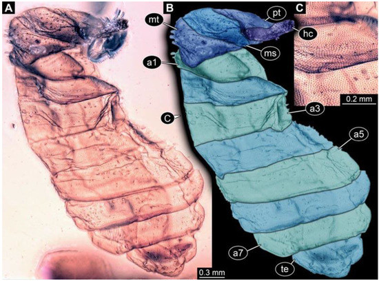 In fact, with more than 100 specimens of stratiomyomorphan larvae of morphotype 1, this seems so far the most abundant morphotype of a holometabolan larva in Myanmar amber when compared with numbers of larvae in other groups. While there are finds of numerous beetle larvae even in a single amber piece (e.g., [40]), or numerous specimens of lacewing larvae, in some cases with several dozen specimens (e.g., [41,42,43,44,45]), none of these morphotypes is known from even close to 100 specimens. This emphasizes not only the assumed ecological importance of these larvae, but also that dipteran larvae in terrestrial habitats are in fact not rare in the fossil record, rather they have so far not been given enough attention [5,46].