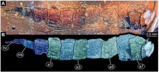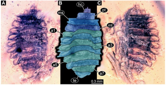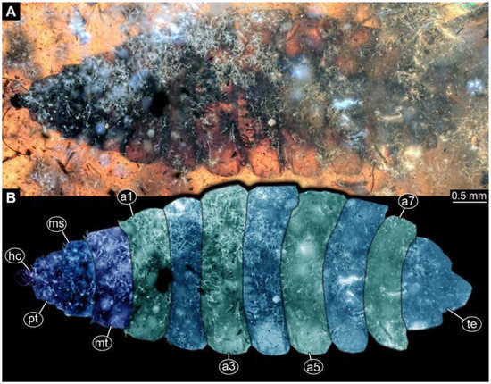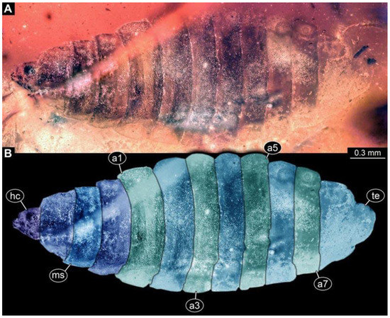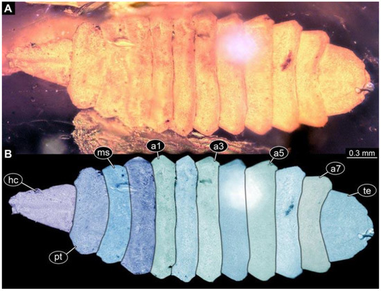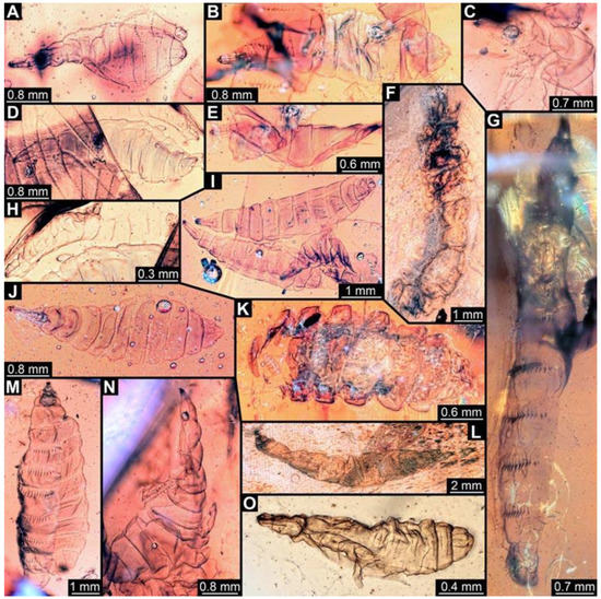 All specimens examined in this study are part of the Palaeo–Evo–Devo Research Group Collection of Arthropods, Ludwig Maximilian University of Munich, Germany. The specimens were legally purchased on the trading platform ebay.com from two traders (burmite-miner and macro-cretaceous). All fossil specimens reported here are preserved in Kachin amber from Myanmar, which was dated to an age of about 100 million years [18,19,20]. In total, 118 amber pieces with a total of 143 specimens were examined; of these, 131 individuals in 102 amber pieces were identified as larvae of Stratiomyomorpha (details in Table S1 and File S2). Additionally, 71 extant specimens retrieved from the literature were included in the analysis. For details of all specimens, see electronic Supplement (Table S1 and File S2).