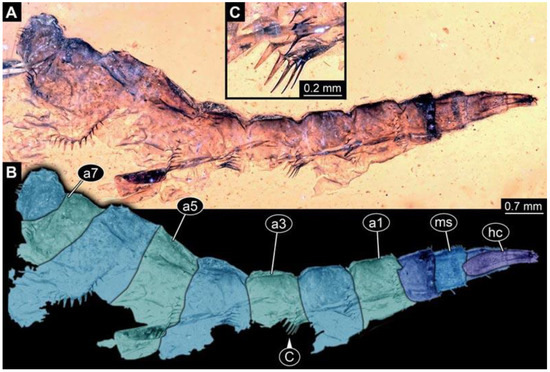 Fossil larva of morphotype 1, specimen PED 0701. (A). Lateral view. (B). Colour-marked. (C). Close-up of ventral spine-like setae. Abbreviations: a1–a7 = abdomen units 1–7; hc = head capsule; ms = mesothorax.