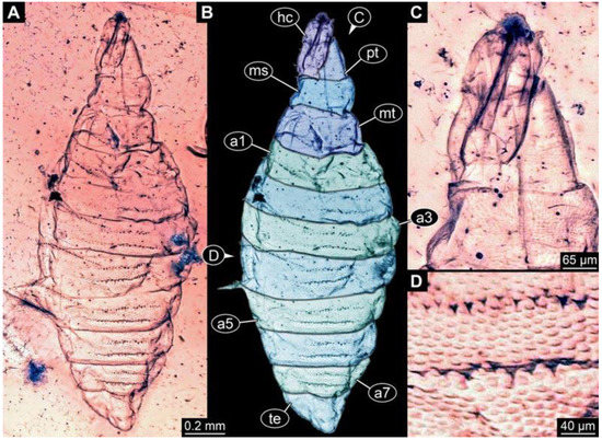 All three morphotypes share certain general features (cf. [13]): Small larva, dorsoventrally flattened with a spindle-shaped body, and covered in pellets, presumably of calcium carbonate (Figure 1F). Body with twelve visible units, head capsule, and eleven trunk units; three segments of the thorax (prothorax, mesothorax, metathorax) and eight units of the abdomen (seven abdomen segments and trunk end = compound structure of several undifferentiated segments; Figure 1A).