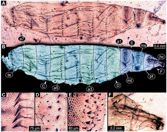 (6) PED 0511: Specimen oblique in the amber (Figure 7A), numerous particles conceal details. Surface structure apparent. Head capsule and thorax dark pigmented. Ventral spine-like setae on abdomen segments well developed. Specimen bent in the middle of the trunk. No measurements possible due to position of the larva.