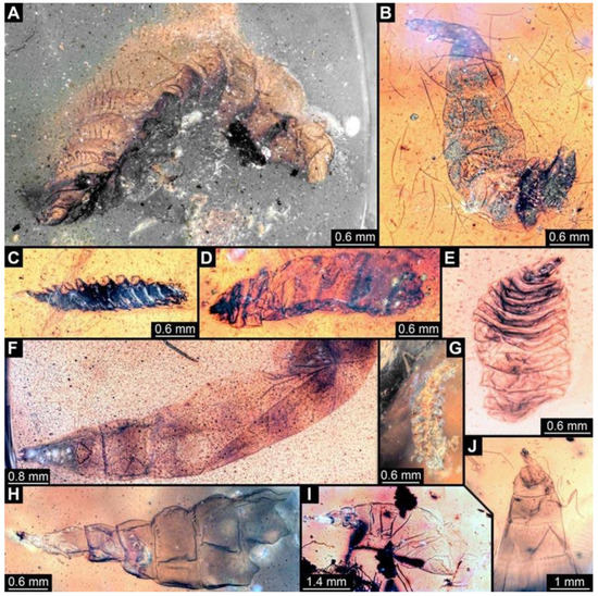 Several fossil larvae. (A). PED 0511. (B). PED 0628. (C). PED 0723. (D). PED 1188. (E). PED 1349. (F). PED 0490. (G). PED 0548. (H). PED 0714. (I). PED 0567-1. (J). PED 0567-3.