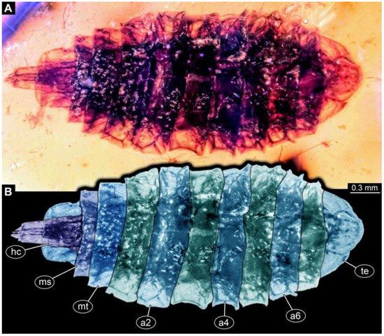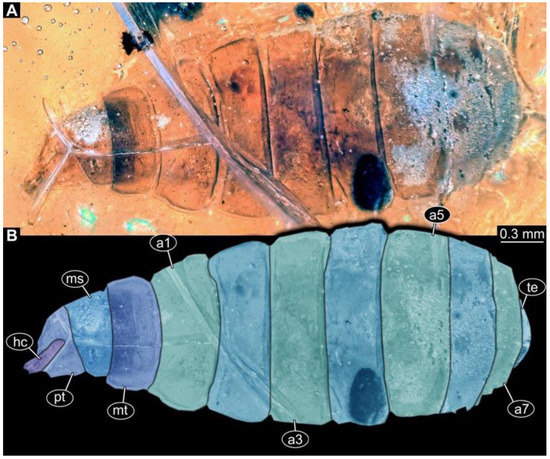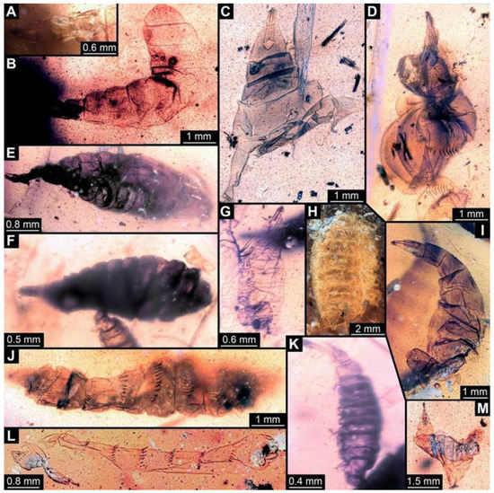 - Batelka, J.; Prokop, J.; Pohl, H.; Bai, M.; Zhang, W.; Beutel, R.G. Highly specialized Cretaceous beetle parasitoids (Ripiphoridae) identified with optimized visualization of microstructures: Cretaceous primary larvae of Ripiphoridae. Syst. Entomol. 2019, 44, 396–407. [Google Scholar] [CrossRef]