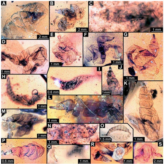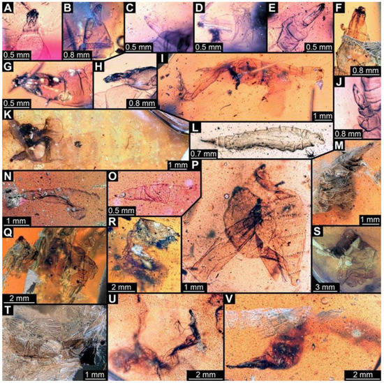 So far, 17 formally described species of stratiomyomorphans have been recorded in amber deposits of Myanmar: five species of Stratiomyidae, seven of Xylomyidae, and five of the exclusively fossil group Zhangsolvidae [14,15,16,17]. The fossil larvae could not be identified as conspecific with any of the species known as adults [12,13].