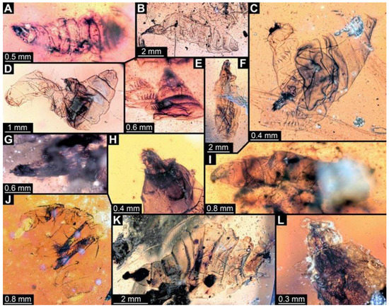 (23) PED 0611-2: Specimen concealed by dirt particles and blurry amber, posterior part crumpled (Figure 8K). Head capsule and trunk well preserved. Total body length could not be reliably measured. Dimensions: body width 0.74 mm, head capsule length 0.33 mm, head capsule width 0.1 mm.
