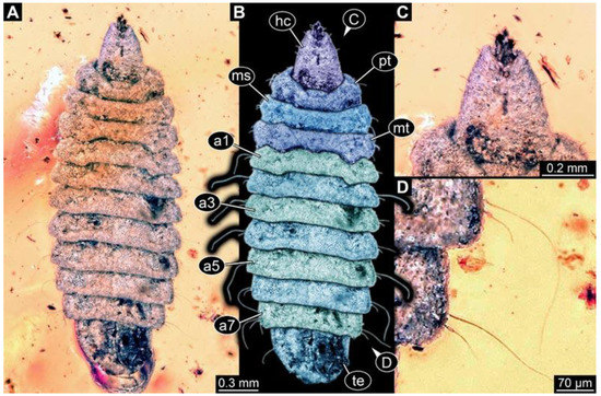 (7) PED 0628: Specimen bent in the anterior region, torn apart at the posterior end, slightly concealed by irregularities and particles in the amber (Figure 7B). Surface structure apparent. Head capsule well preserved. Long ventral spine-like setae on abdomen segments well developed. Dimensions: body width 1.23 mm, head capsule length 0.84 mm, head capsule width 0.14 mm.