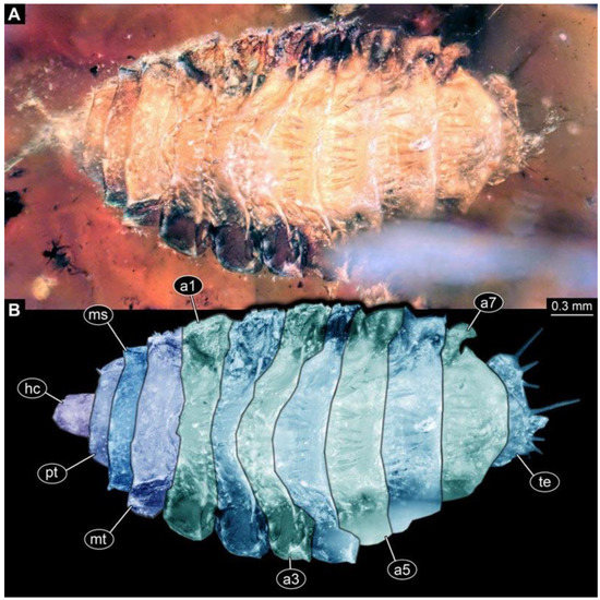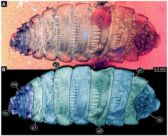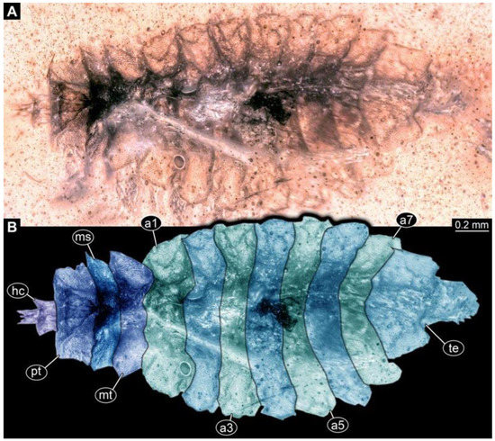 Fossil larva of morphotype 1, specimen PED 0685. (A). Full view of specimen. (B). Colour-marked. Abbreviations: a1–a7 abdomen units 1–7; hc = head capsule; ms = mesothorax.
