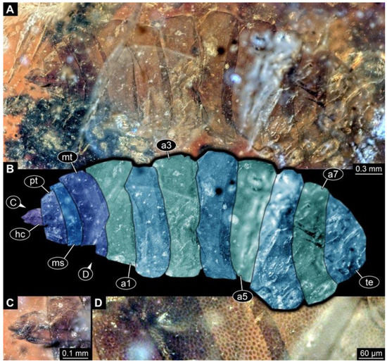 Of course, it also needs to be considered that other representatives of Insecta were possible predators of the fossil stratiomyomorphan larvae. Checker beetles, Cleridae, are well known to have larvae living inside wood, preying on xylophagous larvae. Such larvae are well known in younger ambers [61]. Additionally, in Myanmar amber, larvae of Cleridae have been reported [62], yet these larvae appear to parasitise bees and not to prey on wood-associated larvae.