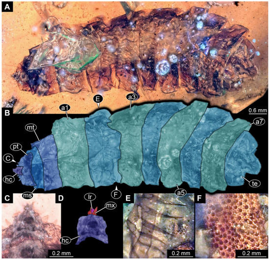 (18) PED 0611-1: Specimen very darkly pigmented (Figure 8F), dirt particles and blurry amber conceal most details. Head capsule well preserved. Dimensions: body length 3 mm, body width 1 mm, head capsule length 0.42 mm, head capsule width 0.2 mm.