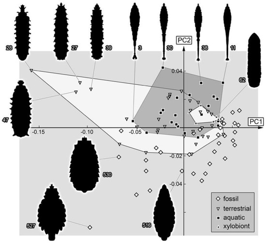For shape analysis, black-and-white outlines of the specimens (from either ventral or dorsal view) were made with Inkscape, which is freeware for editing vector graphics. The best-preserved halves of each specimen were outlined, copied, mirrored and merged to obtain a symmetrical shape of the larvae. In cases in which the larvae were slightly bent, shapes were straightened by outlining each segment of the convex side of the body and rearranging while maintaining the original features of the larvae [22]. Most shapes were re-used from Baranov et al. [13], others were based on new material reported here and from the literature (details in Table S1 and File S2). These shapes were converted into mathematical functions with the freeware Shape and further processed using a principal component analysis. Resulting values were plotted for comparison. Plots were edited in Adobe Illustrator CS2.