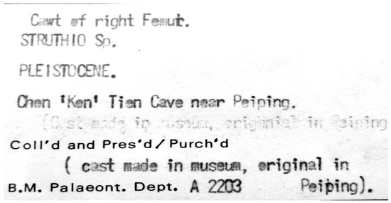 Label of cast of ostrich femur NHM PV A 2203. “Chen ‘Ken’ Tien” is a misspelling for Chou Kou Tien, the spelling used in the 1930s for Zhoukoudian. “Peiping” was the name used for Beijing at that time.
