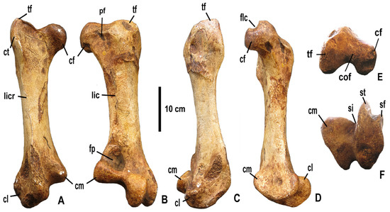PV A 2203 shows a massive trochanter femoris (Figure 2, tf); the cranial face of which is slightly concave, while the caudal face is convex. The cranial margin of the facies articularis antitrochanterica forms a ridge which overhangs the cranial face of the trochanter. On the cranial face, the crista trochanteri (ct) is prominent. The caput femoris (cf) is large, well rounded, and bears a deep, groove-like fovea ligamenti capitis (flc). The collum femoris (cof) is relatively short. A pneumatic foramen (pf) is located on the caudal surface of the bone, close to its proximal margin. The diaphysis is robust and straight. A well- marked linea intermuscularis is present both on the cranial and on the caudal face. The linea intermuscularis cranialis (licr) runs in a slightly curved line, close to the lateral margin of the shaft, from the distal end of the crista trochanteri to the inception of the condylus lateralis (in this area. the surface of the bone is damaged, showing the cancellous tissue inside). The linea intermuscularis caudalis (lic) is rugose and close to the medial margin of the bone. It extends from the base of the collum to the area just proximal to the fossa poplitea, where it curves medialward. The fossa poplitea (fp) is rounded, not very deep, but wide, bordered proximomedially by a thickening of the bone which forms a protrusion along the medial margin of the femur. It is bounded distally by the pulley-like caudal part of the condylus medialis. The condylus medialis (cm) is smaller than the condylus lateralis (cl), which extends much farther distally than its medial counterpart. The condyles are separated by a deep sulcus intercondylaris (si). The condylus medialis projects more or less equally cranially and caudally and bears a depression on its medial surface. The condylus lateralis projects more strongly caudally than cranially and is subdivided into two semicondyles (to use Elzanowski’s terminology [13]), which are separated by a deep and relatively wide cleft, the sulcus fibularis. The medial semicondylus tibiofibularis (st) is bulbous and broader than the lateral semicondylus fibularis (sf); the latter is relatively narrow and extends cranially into the epicondylus lateralis.