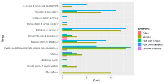 Classifying species according to the likelihood of finding intact habitat is valuable for assessing the utility of reintroductions in progressing species recovery, but habitat quantity and quality are, of course, only part of the picture. Figure 1presents the threats identified in the Red List accounts of EW species [] according to the number of times each threat is listed and presented by the timeframe over which Red List assessors reported the threats to be operating. A number of IUCN-recognised threats are implicit in the intactness analysis presented above (Section 2.2), e.g., urbanisation causes the loss of native vegetation and transportation corridors will result in fragmentation, both of which constitute a loss of ‘intactness’. However, it is valuable to look at how threats that are unrelated to habitat loss are also frequent causes of the extirpation of EW species from the wild. For example, invasive species, genes and diseases, pollution, climate change, and geological events account for threats to 40 EW species. Because these threats operate independently to those that cause habitat fragmentation and loss, this finding further compounds any pessimism regarding the future of EW species; even where habitat availability is relatively good, a number of extensive threats might further complicate species recovery to the wild. Furthermore, the prevalence of threats that are listed as “past, unlikely to return” might be interpreted optimistically to mean that the threats would no longer cause a problem to EW recovery in the wild. Unfortunately, for many of these past threats, the damage has already been done and whilst threats such as agricultural conversion and natural system modifications are judged ‘unlikely to return’, it cannot be assumed that the habitat has been restored, nor that all adverse impacts have been resolved.