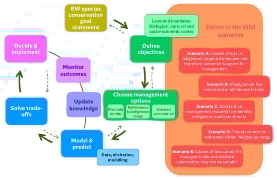 IUCN Conservation Translocation Specialist Group’s structured decision-making cycle adapted to incorporate scenarios that exemplify the situation of Extinct in the Wild species.