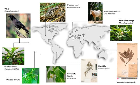 Extinct in the Wild species whose indigenous range is associated with ecoregions categorized as having a high proportion of intact habitat. Photo credits: Abutilon pitcairnensis: Salix, CC BY-SA 4.0 https://creativecommons.org/licenses/by-sa/4.0 accessed on 14 December 2022, via Wikimedia Commons; Ochrosia brownii: David H. Lorence, Jean-François Butaud, CC BY 4.0, via Wikimedia Commons; Cyanea pinnatifida: David Eickhoff from Pearl City, Hawaii, USA, CC BY 2.0 <https://creativecommons.org/licenses/by/2.0>, accessed on 14 December 2022 via Wikimedia Commons; Alala: U.S. Fish and Wildlife Service, public domain, accessed on 14 December 2022 via Wikimedia Commons; Wyoming toad: USFWS Mountain-Prairie, credit Sara Armstrong, CC BY 2.0 <https://creativecommons.org/licenses/by/2.0>, accessed on 14 December 2022 via Wikimedia Commons; Oryx dammah: Albinfo, CC BY-SA 3.0 <http://creativecommons.org/licenses/by-sa/3.0/>, accessed on 14 December 2022 via Wikimedia Commons; Kalimantan mango: https://toptropicals.com/catalog/uid/mangifera_casturi.htm; Mangifera rubropetala: Mangifera rubropetala Kosterm collected in Malaysia by Naturalis Biodiversity Center (licensed under http://creativecommons.org/publicdomain/zero/1.0/ accessed on 14 December 2022); Mancillo: Field Museum of Natural History—CC BY-NC 4.0, accessed on 14 December 2022.