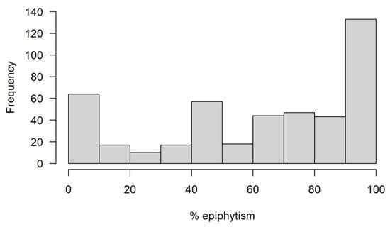 Typically, the tendency for epiphytism in a particular genus or family has been assessed by the relative number of “epiphytic species”, e.g., [16,35] or verbal characterisations, e.g., [19]. The current study introduces a new method. The results of all three approaches, which are summarized in Table 2, are generally numerically consistent, particularly in the more species-rich genera.