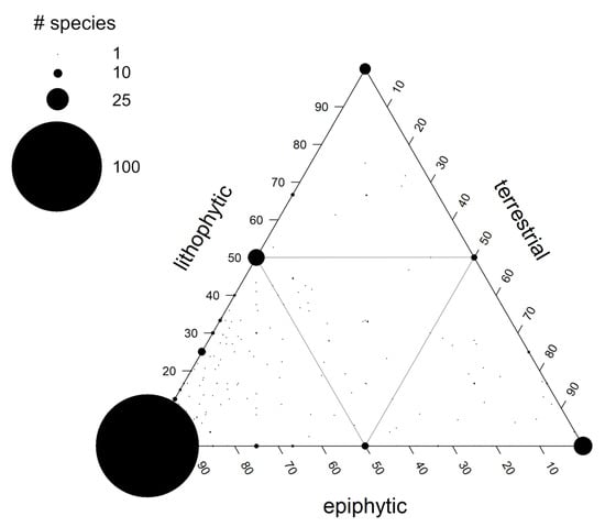 Yet another problem when trying to quantify the degree of epiphytism of a given species is regional variation. For instance, ferns of the Polypodium vulgare complex are usually terrestrial but may occur as obligate epiphytes with high arboreal abundances in certain regions, e.g., [9,10,11]. Similarly, the bromeliad Aechmea distichantha occurs almost entirely epiphytically at the moist end of its distribution but terrestrially or lithophytically at the dry end [12].