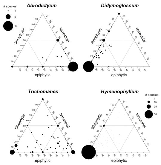 Distribution of 28 Abrodictyum, 47 Didymoglossum, 61 Trichomanes and 233 Hymenophyllum species in the epiphyte-lithophyte-terrestrial space. Symbol size varies with the number of species with the same values of EV, LV and TV. Scaling is identical for Abrodictyum, Didymoglossum and Trichomanes but differs for Hymenophyllum.