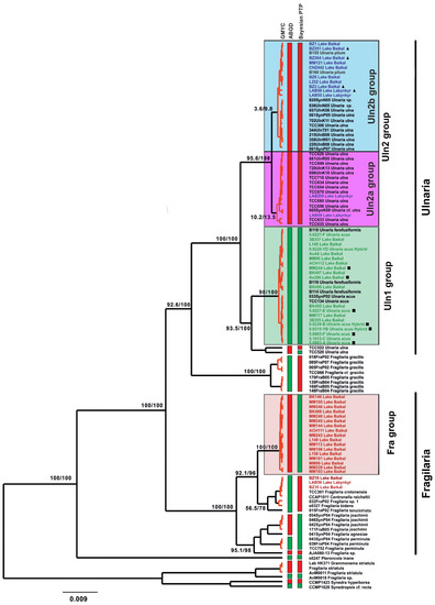 Bayesian phylogenetic tree reconstructed based on the rbcL genetic marker (BEAST program). The nodes for the key clusters specify ultrafast bootstrap maximum likelihood supports and Bayesian posterior probabilities. Clusters of species-level sequences identified by the results of GMYC delimitation are highlighted in red. Each black branch represents a species represented by one sequence. The results of species delimitation by the ABGD and Bayesian PTP methods are indicated by alternating rectangles (red and green), highlighting the clusters of species-level sequences. The sequences obtained in this study were included in three different groups: Fra (red), Uln1 (green) and Uln2 (Uln2a—fuchsia and Uln2b—blue).