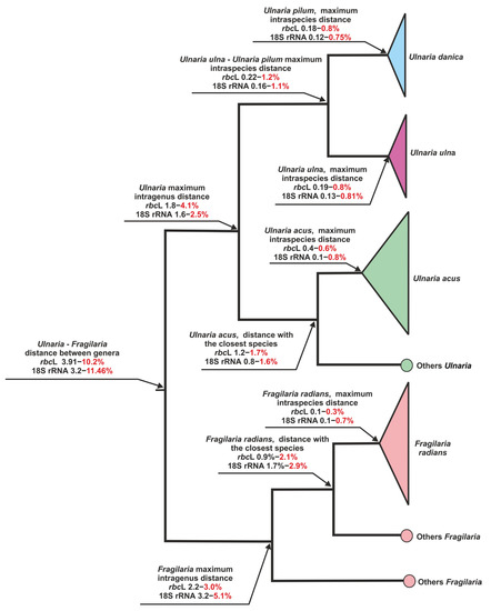 All the described thresholds of genetic distances (species and genera levels) are summarized in a single scheme and are shown in Figure 3. For the Uln2a cluster, the maximum intraspecific distance, considering the 95% confidence interval for the rbcL marker, was 0.8% of substitutions. For the 18S rRNA marker, this was 0.75% of substitutions. For the Uln2b cluster, the maximum intraspecific distance, considering the 95% confidence interval for the rbcL marker, was 0.8% of substitutions. For the 18S rRNA marker, this was 0.81% of substitutions. For the Uln1 cluster, the maximum intraspecific distance, considering the 95% confidence interval for the rbcL marker, was 0.6% of substitutions. For the 18S rRNA marker, this was 0.8% of substitutions. For cluster F. radians the maximum intraspecific distance, considering the 95% confidence interval for the rbcL marker, was 0.3% of substitutions. For the 18S rRNA marker, this was 0.7% of substitutions. At the level of genera, the maximum distance within the genus Ulnaria, considering the 95% confidence interval for the rbcL marker, was 4.1% of substitutions. For the 18S rRNA marker, this was 2.5% of substitutions (Figure 3). The maximum distance within the genus Fragilaria, considering the 95% confidence interval for the rbcL marker, was 3.0% of substitutions. For the 18S rRNA marker, this was 5.1% of substitutions. If the distance between the two main sequences exceeds the specified thresholds of 4.1% of substitutions for the rbcL marker and 5.1% for the 18S rRNA marker then these sequences belong to different genera of diatoms.