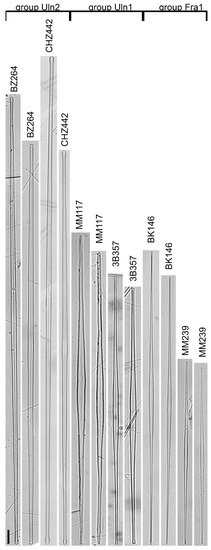 Valves of strains of Uln1 group (MM117 and 3B357), Uln2 group (BZ264 and CHZ 442), Fra group (BK146 and MM239). LM. Scale bar: 10 μm.