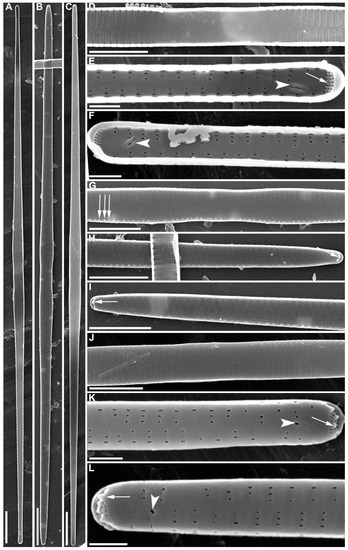 Valve structure of strains Fra group, strains MM101 (A,D–F,C,J–L) and MM113 (B,G–I). SEM. Three complete valves: (A) inside view; (B) valve with margin spines, outside view; (C) valve without margin spines, outside view; (D) central area detail of (A); (E,F) apex detail of (A) (arrow—ocellulimbus; arrowhead—rimoportula); (G) central area detail of (B) (arrows—marginal spines); (H,I) apex detail of (B) (arrows—apical spines); (J) central area detail of (C); (K,L) apex detail of (C) (arrows—apical spines; arrowheads—holes of rimoportula). Scale bar: (A–C)—10 μm; (D,G–J)—5 μm; (E,F,K,L)—1 μm.