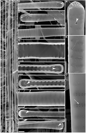 Valve structure of strains Uln1group, strains 3B357 (A,D–F), 3B355 (B,C,F–L,O) and ACH274 (M,N). SEM. Three complete valves: (A) valve without apex spines, outside view; (B) inside view; (C) valve with apex spines, outside view; (D,E) apex detail of (A) (arrow—ocellulimbus); (F) central area detail of (A); (G) central area detail of (A); (H,I) apex detail of (B) (arrowheads—rimoportula); (J) central area detail of (C); (K,L) apex detail of (C) (arrows—apical spines; arrowheads—holes of rimoportula); (M–O) fine structure of areolae and velums on different valve area of different strains (arrowhead—a hole of rimoportula; arrow—flat velum on the areolae). Scale bar: (A–C)—10 μm; (D–O)—1 μm.