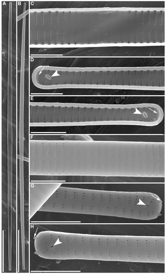 Valve structure of strains Uln2 group, strain BZ251. SEM. Two complete valves: (A) inside view; (B) outside view; (C)—central area detail of (A); (D,E) apex detail of (A) (arrows—ocellulimbus; arrowheads—rimoprtula); (F) central area detail of (B); (G,H) apex detail of (C) (arrows—apical spines; arrowheads—holes of rimoportula). Scale bar: (A,B)—50 μm; (C–H)—5 μm.
