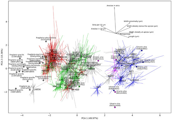 Principal component analysis (PCA) of strain morphometry. Each “snowflake” corresponds to a single strain, with the central point being a vector of strain averages for each trait and ray endpoints corresponding to individual cells. The strains are designated according to the name of the strains in Supplementary Table S3. The strains are painted and flashed to the groups in which they entered the phylogenetic reconstruction of the rbcL genetic marker (Figure 1).
