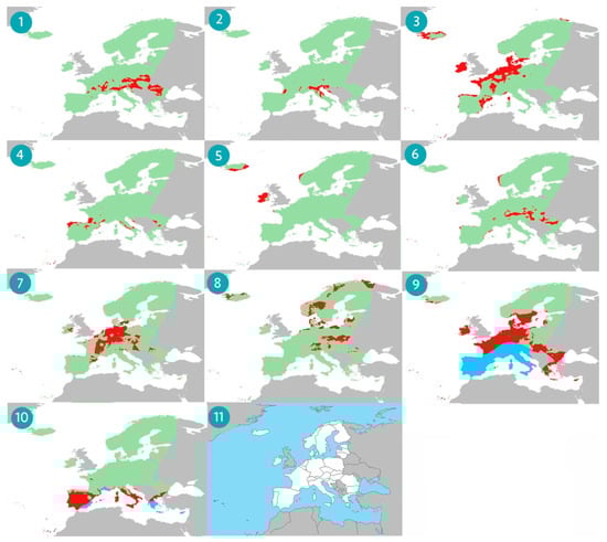 The prediction computed using the MaxEnt model of the pet-traded gastropods with potential occurrence in a “large area” of EU (= covered more than 5% of the territory). The maps show native range in blue and suitability in red, representing a high probability of establishment for these species: (1) Anguispira alternata, (2) A. strongylodes, (3) Cochlitoma varicosa, (4) Hadra webbi, (5) Helicophanta bicingulata, (6) Laevicaulis altea, (7) Megalobulimus oblongus, (8) Phaedusa paviei, (9) Rumina decollata, and (10) R. saharica; (11) map of European Union.