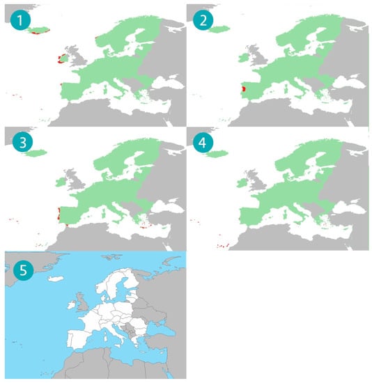 The prediction computed using the MaxEnt model of the pet-traded gastropods with potential occurrence in a “medium area” of EU (= covering less than 5% of the territory). The maps show suitability in red, representing a high probability of establishment for these species: (1) Acavus superbus, (2) Archachalina ventricosa, (3) A. marginata, and (4) Lissachatina allisa; (5) map of European Union.