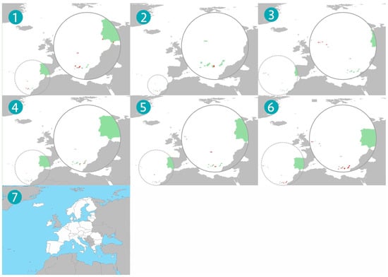 The prediction computed using the MaxEnt model of the pet-traded gastropods with potential occurrence in a “small area” of EU (= covering only Macaronesia in the southern part of the territory). The maps show suitability in red, representing a high probability of establishment for these species: (1) Achatina balteata, (2) Helicophanta magnifica, (3) Limicolaria aurora, (4) L. flammea, (5) Lissachatina fulica, and (6) L. reticulata; (7) map of European Union and Macaronesia belonging to the EU.