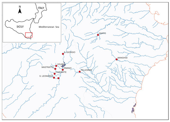 In Sicily, autochthonous brown trout populations inhabit only the eastern part of the island, probably due to the differences in topography and hydrology between the western and the eastern areas. Although, historically, the species was distributed both in the north and in the south, currently, Sicilian brown trout are confined to the southeast, in a few rivers of the Hyblean Plateau, in the Ragusa and Siracusa provinces [3]. Based on their morphological characteristics, these populations have been recognized as a distinct species named Salmo cettii Rafinesque 1810 [4,5,6]. Despite previous genetic (mitochondrial and nuclear) data that clearly related Sicilian brown trout with Atlantic brown trout from Morocco and the Iberian Peninsula [7,8,9,10,11], recently, Hashemzadeh et al. [12], combining SNPs genotyping and mitochondrial DNA sequences, supported the recognition of S. cettii as a distinct species. In any case, molecular analyses indicate high genetic singularity for Sicilian trout, as they are the unique Italian trout populations naturally derived from a South Atlantic lineage [7,8,13,14].