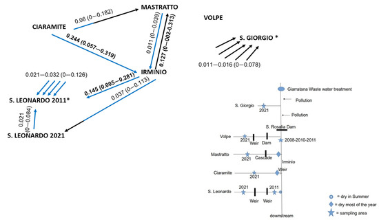 Gene flow direction and migration rate (m) estimates, with its standard deviation in parentheses. Blue and black: downstream and upstream direction, respectively. Only values of m > 0.01 are indicated, and m > 0.1 are highlighted in bold. * Estimates from/to these locations could be highly biased because of its reduced sample size, and m rates were summarized in these cases (note that a low migration rate to San Giorgio (n = 13) comes from all but Volpe locations, whereas San Leonardo 2011 (n = 6) receives migration from all the other locations). A scheme of the Irminio River basin and the putative barriers to gene flow is also shown.