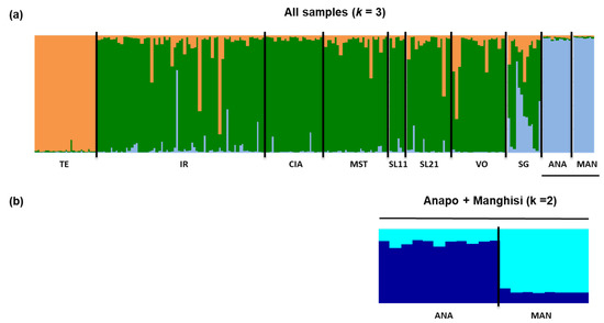 Admixture analyses by STRUCTURE (a) at the highest level of hierarchy (k = 3) and (b) at the low level of hierarchy (Manghisi + Anapo k = 2; all samples k = 4). Each individual is represented as a vertical bar partitioned into segments according to the proportion of the genome belonging to each of the clusters identified (k).
